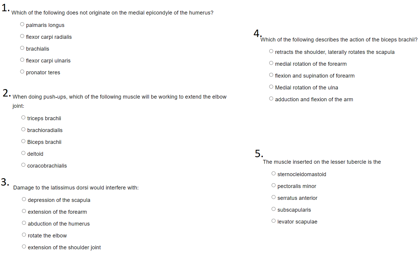 All of the following muscles originate from the scapula EXCEPT ________. The following nerves are located on the following aspects of the humerus. 86 Which of the following DOES NOT arise in part from the lateral intermuscular septum of the arm.